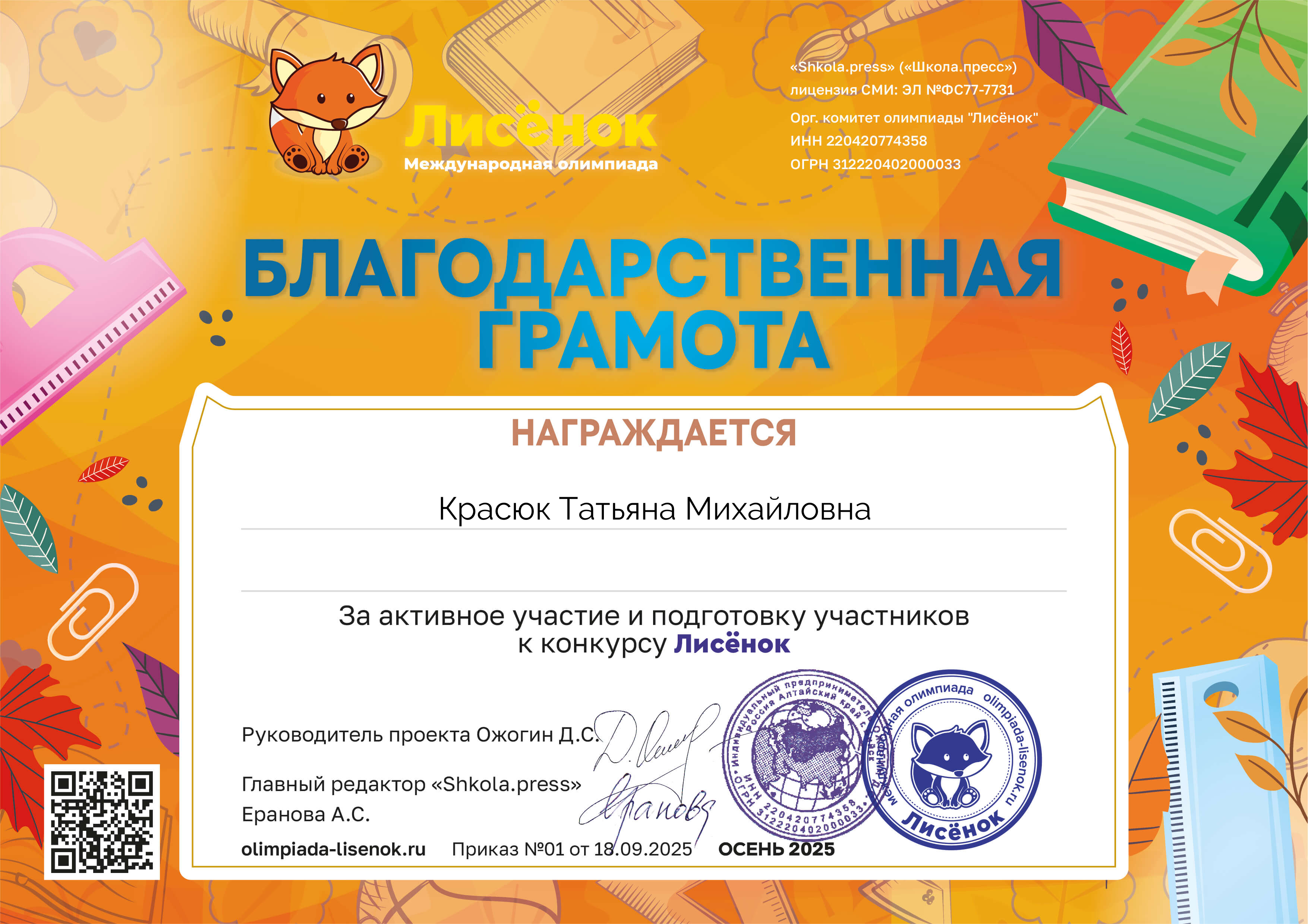 Благодарственная грамота Международной олимпиады "Лисенок"