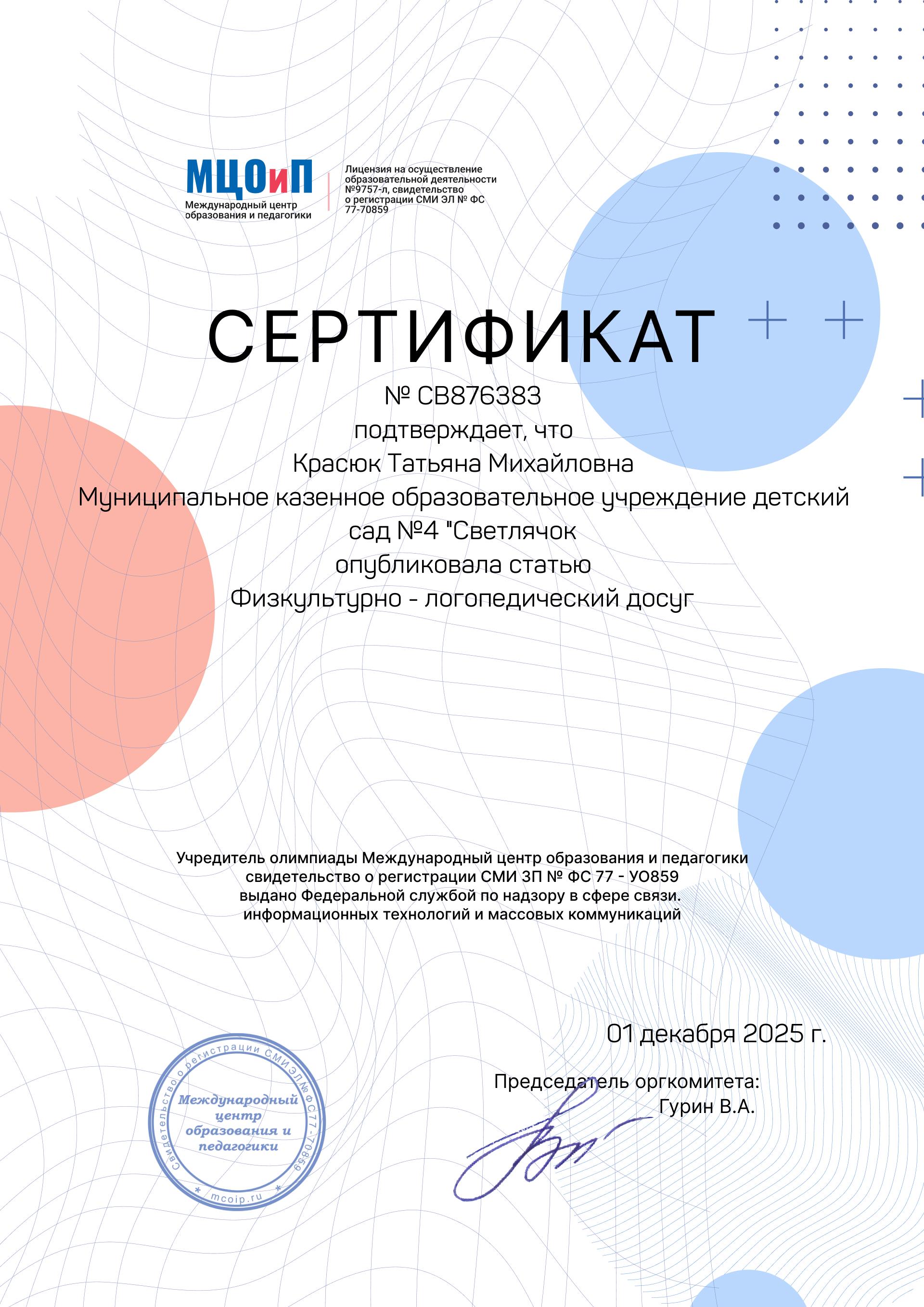 Диплом 1 место в международном конкурсе " Дыхательная гимнастика в физическом воспитании дошкольников" 2019 год