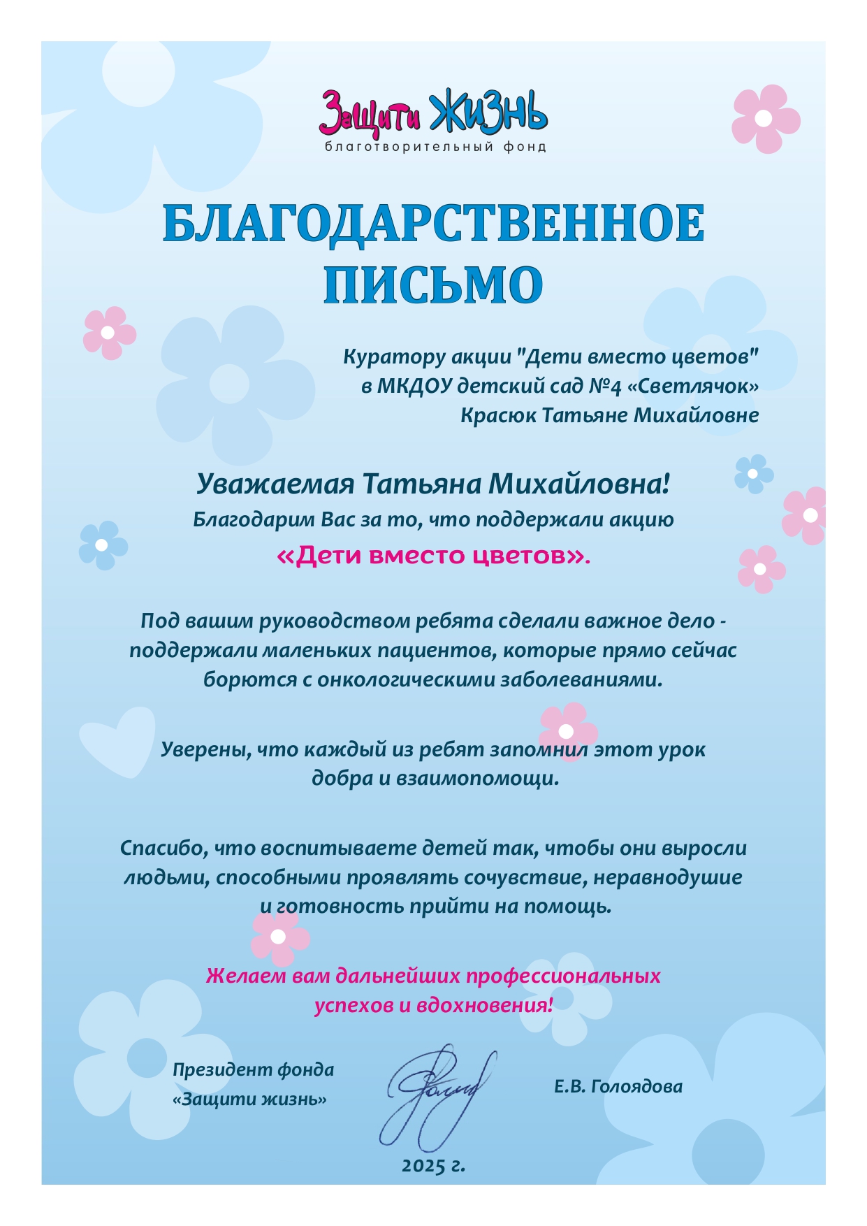 Благодарственное письмо от благотворительного фонда Защити жизнь за акцию "Дети вместо цветов" 2025 год
