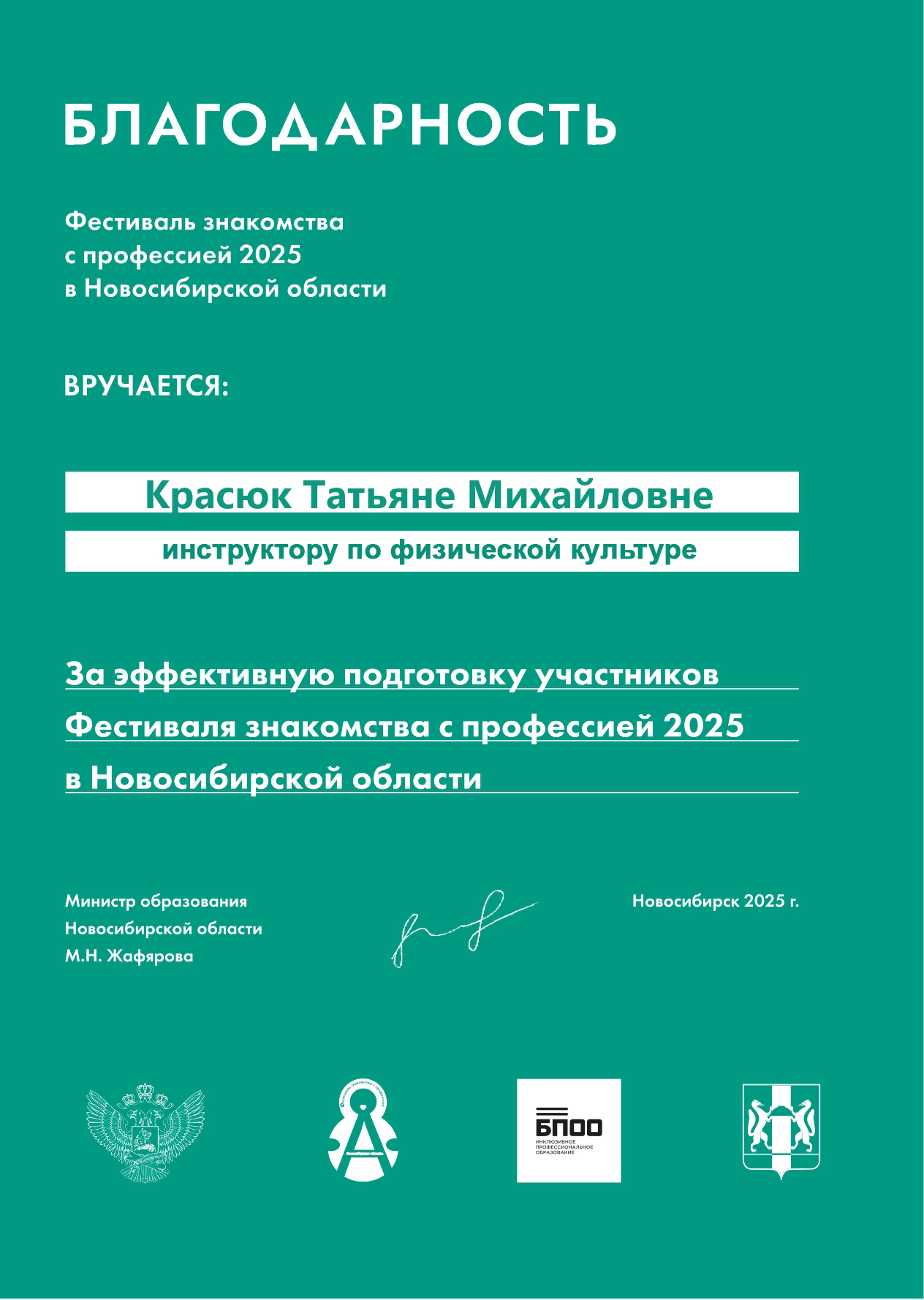 Благодарность "Фестиваль знакомства с профессией 2025 в Новосибирской области"